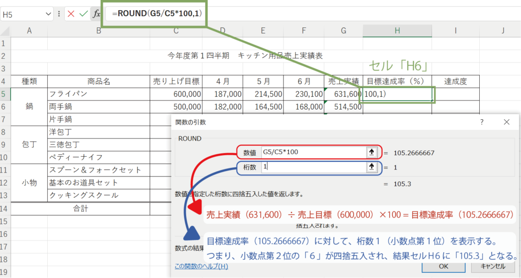 課題は、目標達成率を求めるにあたり、関数を用いて小数点第2位を四捨五入して、第1位までを表示することとします。そのため、まず商品名フライパンの目標達成率にあたるセルの「H6」に対して、求める関数を記入していきます。