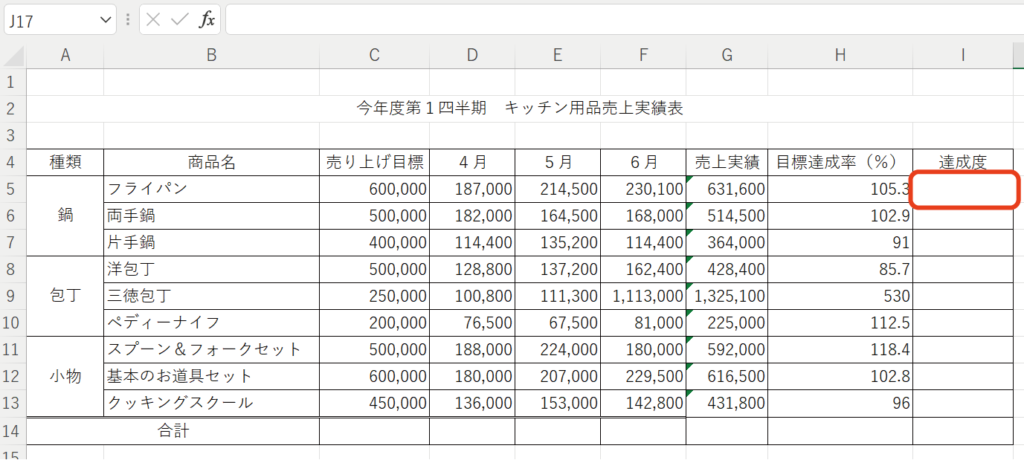 キッチン用品の売り上げに関する資料をExcelを使用して完成させます。表題のようなキッチン用品の売上実績表に「目標達成率」と「達成度」を関数を用いて求めます。表には「売上実績」が記入されており、4~6月分の合計(売上実績)が記入されています。
