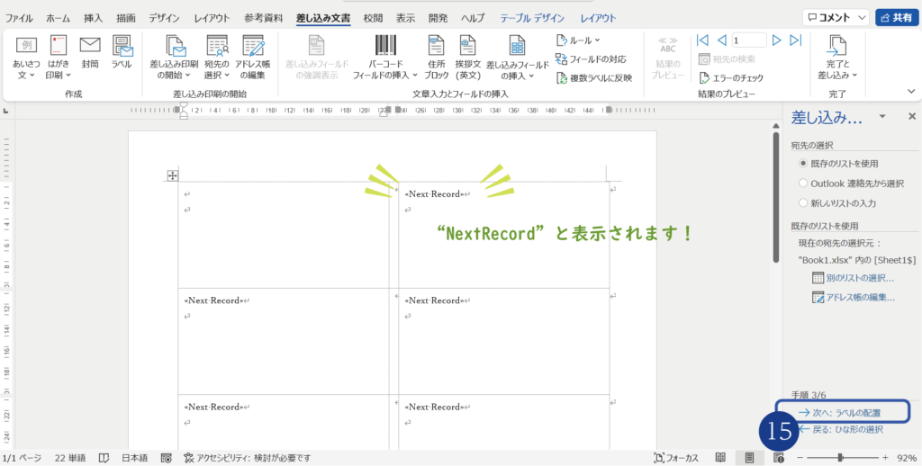 すると、以下の画面のように、ラベルのテンプレートの1つひとつにNext Record”という文字が表示されます。この文字が表示されることで、データを取り込む事前準備が整った状態にあります。