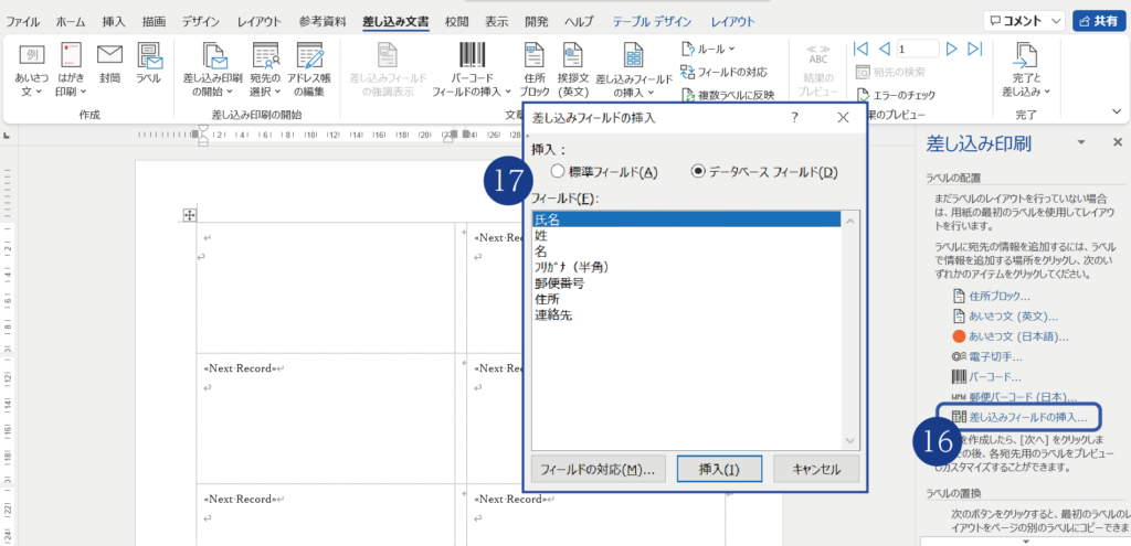 ⑰のダイアログボックスでは、実際に挿入する項目を選びます。ラベルシールなので、通常であれば、相手先の宛名となる項目を入れますよね。”郵便番号”→”挿入”、”住所”→”挿入”、”氏名”→”挿入”、と繰り返します。他の項目として、元のデータには、姓、名、フリガナ(半角)などがあることがわかりますが、今回は先ほどの項目だけで満たされるため、使用しません。