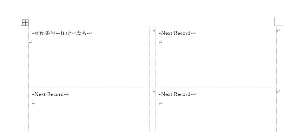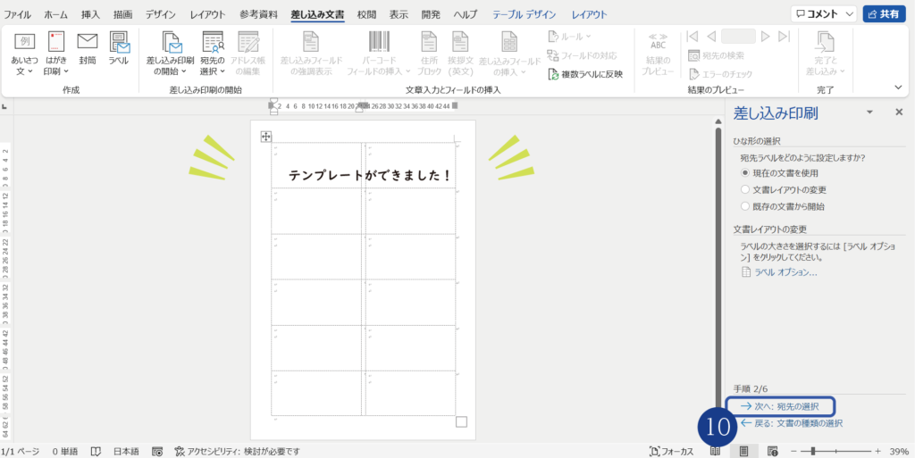 上記の操作をおこない、「OK」をクリックすると、ワード画面にラベルのテンプレートが表示されます。