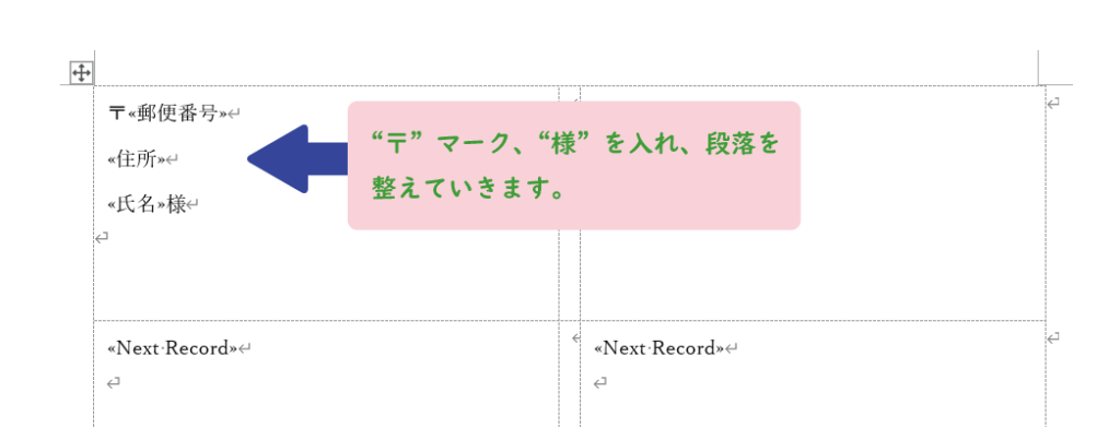次に、ラベルシールの位置の体裁を整えていきます。まずは、郵便番号と書かれた先頭に郵便マークの”〒”を入れます。次に、氏名の後ろに”様”を入れます。最後に、それぞれの行に段落を入れて、ラベルシールに入る項目を調整すると、以下のようになりました。
