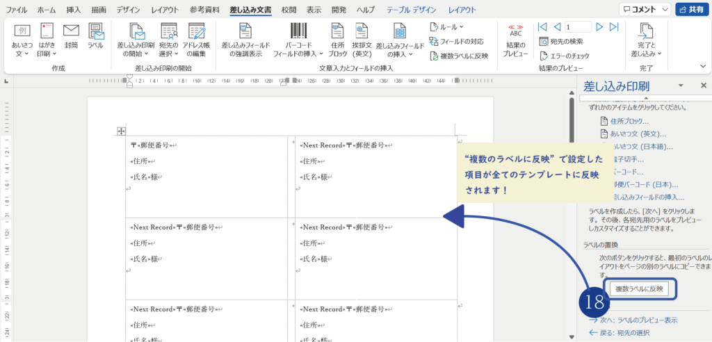 今回は、「差し込み印刷ウィザード」ラベルシールのテンプレート作りについて説明しました。ウィザードを使用してWord文書内のテンプレートとなるラベルシールの枠組みが表示されたあと、Excelを参照しながらウィザードの流れのなかで〒マークや住所、氏名などを挿入していきました。氏名などの段落調整は、任意の間隔で調整していかれたら、より見やすいものになると思います。