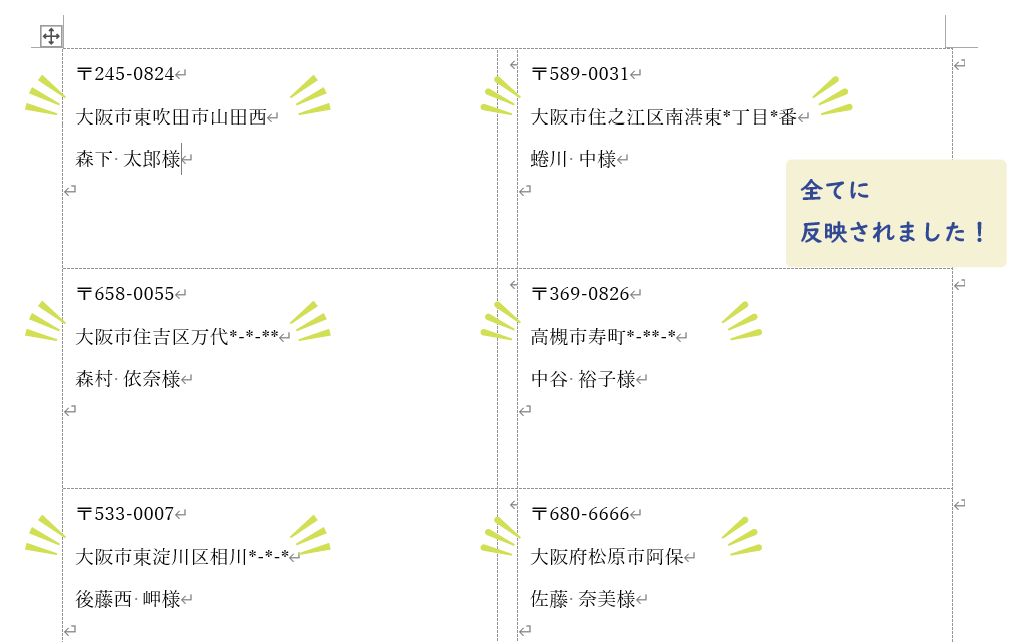 上記の作業を終えると、以下の画面のように、1行中に”郵便番号”、”住所”、”氏名”と3つの項目が並びます。