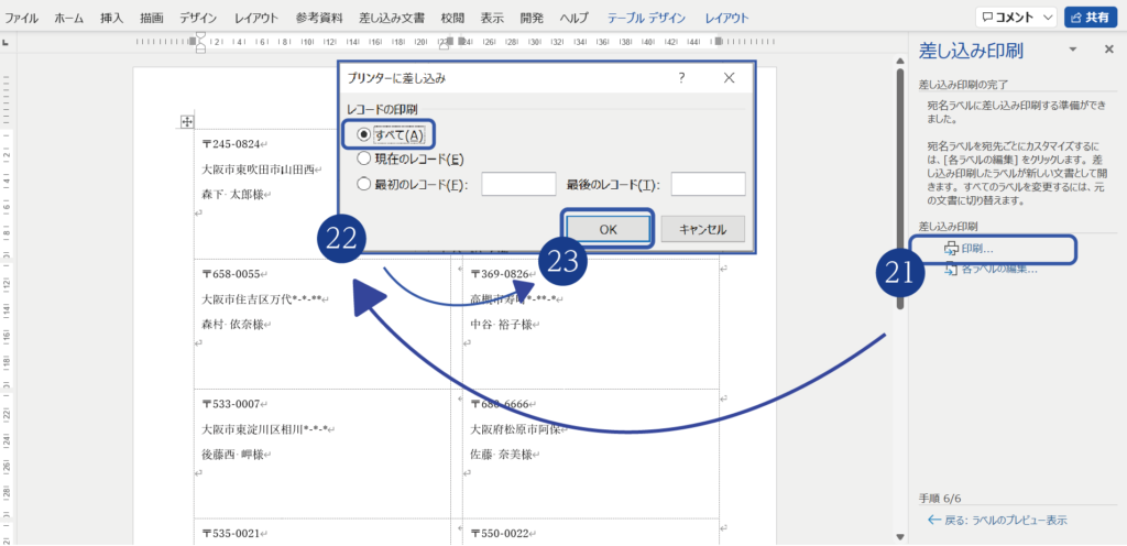 2. 「プリンターに差し込み」ダイアログボックスの「レコードの印刷」→”すべて”を選択