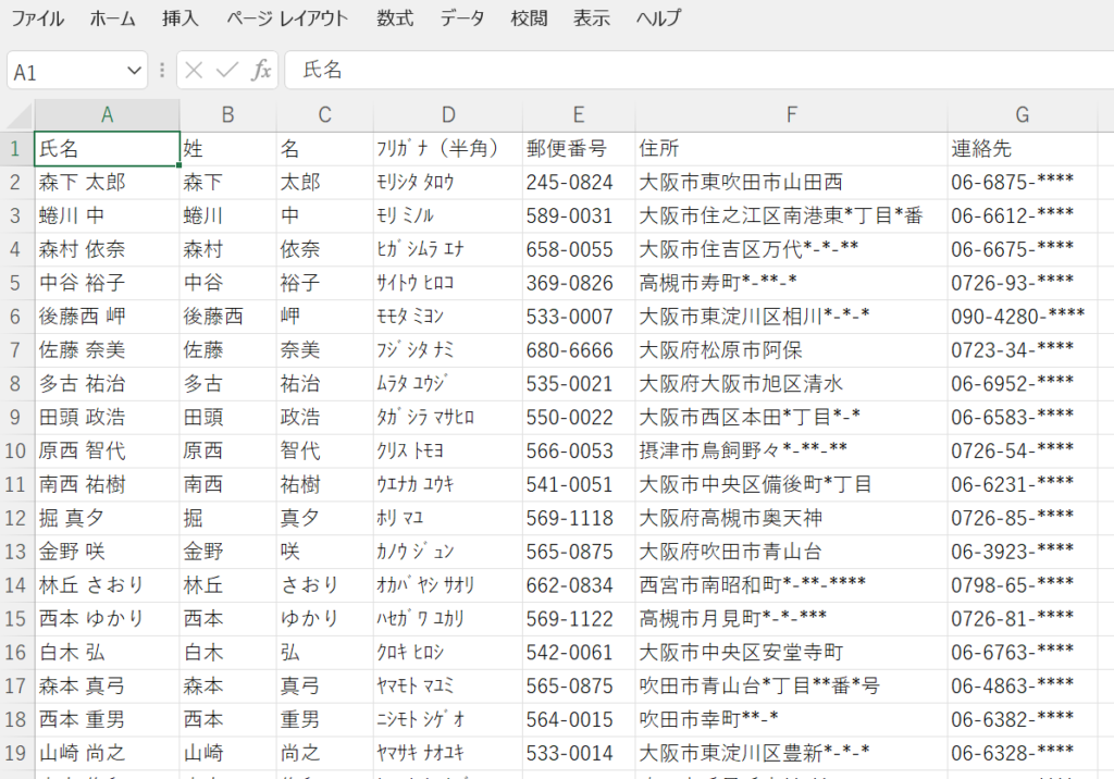 Excelで住所録となるデータを作成します。以下のデータを準備しました。
