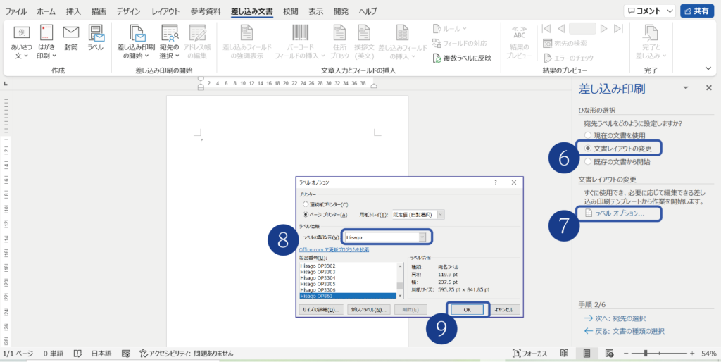 ⑧の「プリンター」の種別では、”ページプリンター”を選択しておきます。次に、「ラベルの製造元」、「製品番号」の選択については、任意で選んでいただけたらと思いますが、今回は「ラベルの製造元」を”Hisago”とし、「製品番号」を”Hisago OP861”と選択しました。