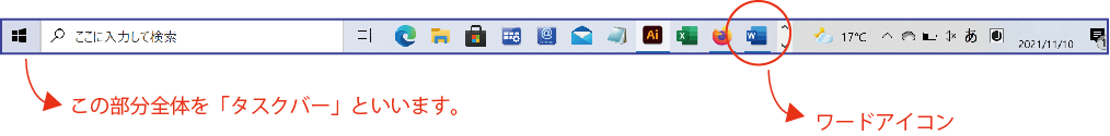 上記の画像では、たとえばワード使用時にタスクバーには、赤丸のように、ワードアイコンが現れます。このアイコンが出ている状態で、アイコンの上にカーソルをもってきて、右クリック → 「タスクバーにピン留めする」を選ぶと、アイコンがタスクバー上に固定されます。すると、ワードを終了しても、タスクバーにワードアイコンが残り、次回からは、このアイコンをクリックするだけでワードが呼び出せるようになります。一度お試しください。