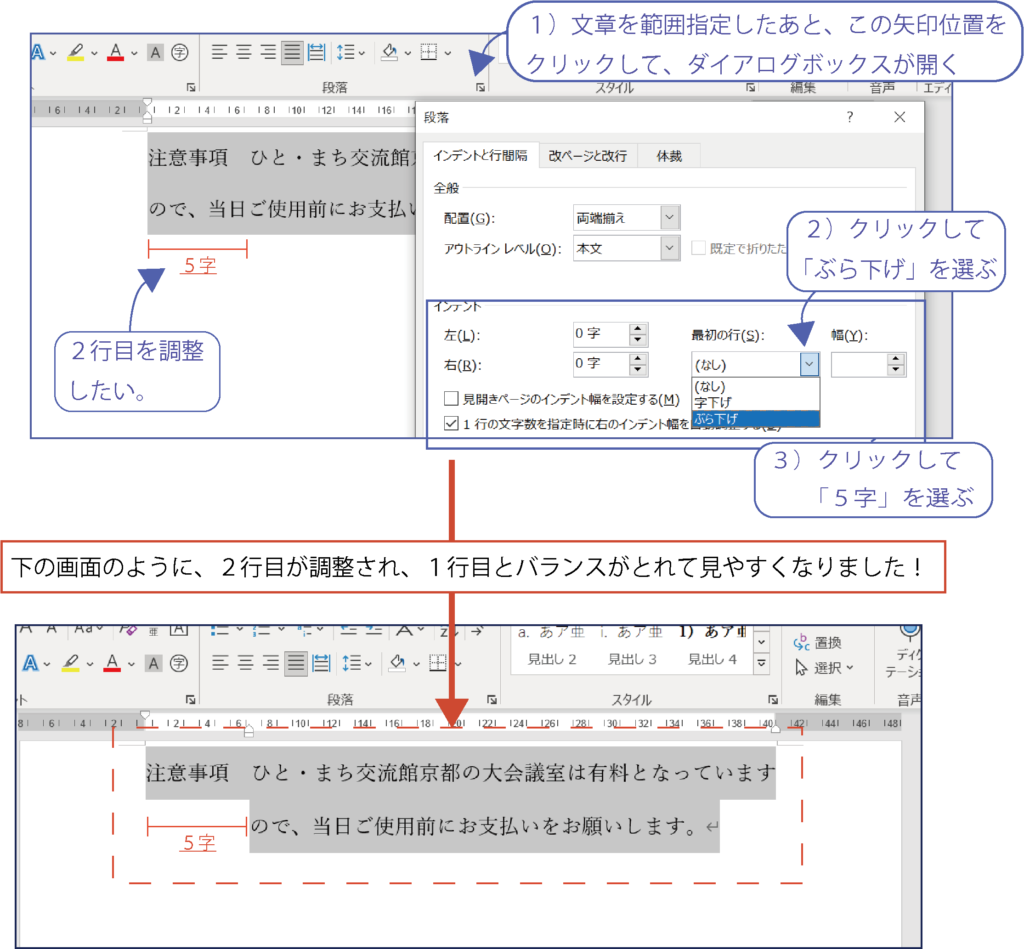 例文を「注意事項 ひと・まち交流館京都の大会議室は有料となっていますので、当日ご使用前にお支払いをお願いします。」としました。下の画面を見ると文章の2行目にある「ので、当日ご使用前~」の文字の始まりをもっと右において1行目とのバランスをとりたいです。そのため、先ほどと同じように、段落を範囲指定して、ダイアログボックスを開き、「最初の行(S)」から「ぶら下げ」を選びます。幅は1行目の「注意事項 」がスペースを含めて5文字のため、「5字」として、「OK」ボタンを押します。