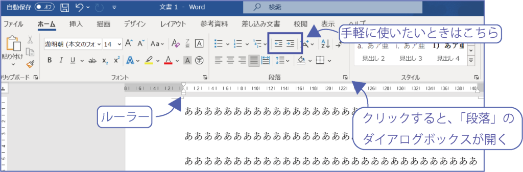 インデントとは、文章の左側に余白を入れる機能のことをいいます。インデントには、「字下げ」機能と「ぶら下げ」機能があります。「ルーラー」と呼ばれる画面上部にある定規の目盛りを使うほか、ホームタブから使用したり、ダイアログボックスと呼ばれる四角いボックスの一覧機能からも使用できます。