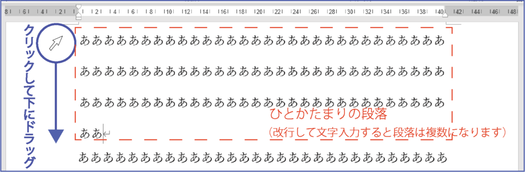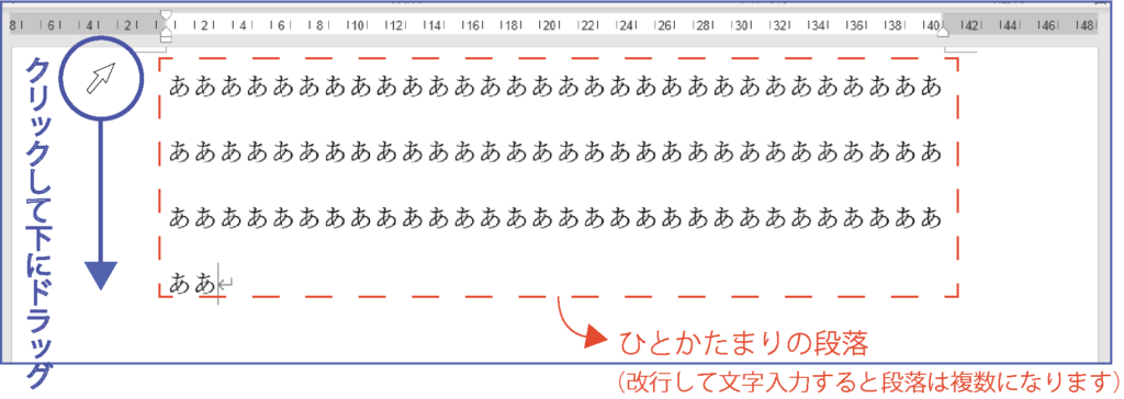 まず、段落を指定します。(複数の段落がない場合は指定は必要ないです)下記の画像を参考に、ワード画面の左側にある余白部分にカーソルを持ってきます。そして、段落1行目辺りから段落最後となる4行目辺りまでを真下にドラッグすることで、文章(段落)の範囲指定ができます。