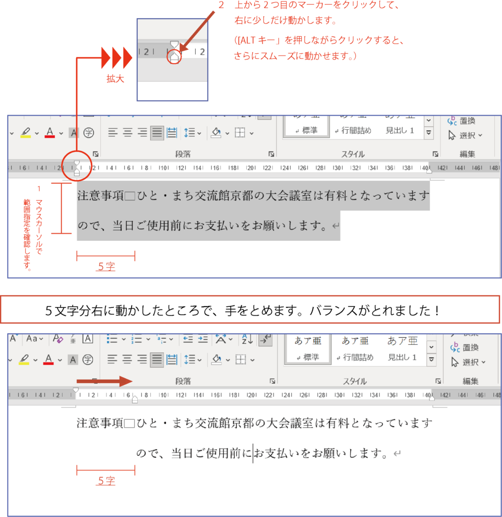 次に「ぶら下げ」機能を「水平ルーラー」を使って、2行目以降の位置調整を行います。同じく、例文を「注意事項 ひと・まち交流館京都の大会議室は有料となっていますので、当日ご使用前にお支払いをお願いします。」としました。下の画面を見ると文章の2行目にある「ので、当日ご使用前~」の文字の始まりをもっと右において1行目とのバランスをとりたいです。