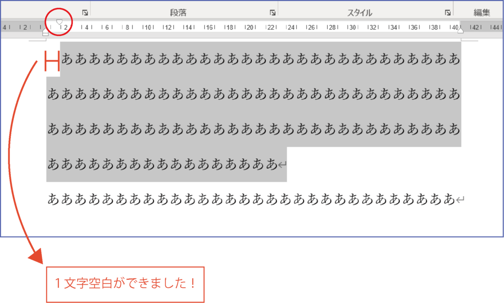 すると、下記の画像のように段落の1行目が1字下がります。