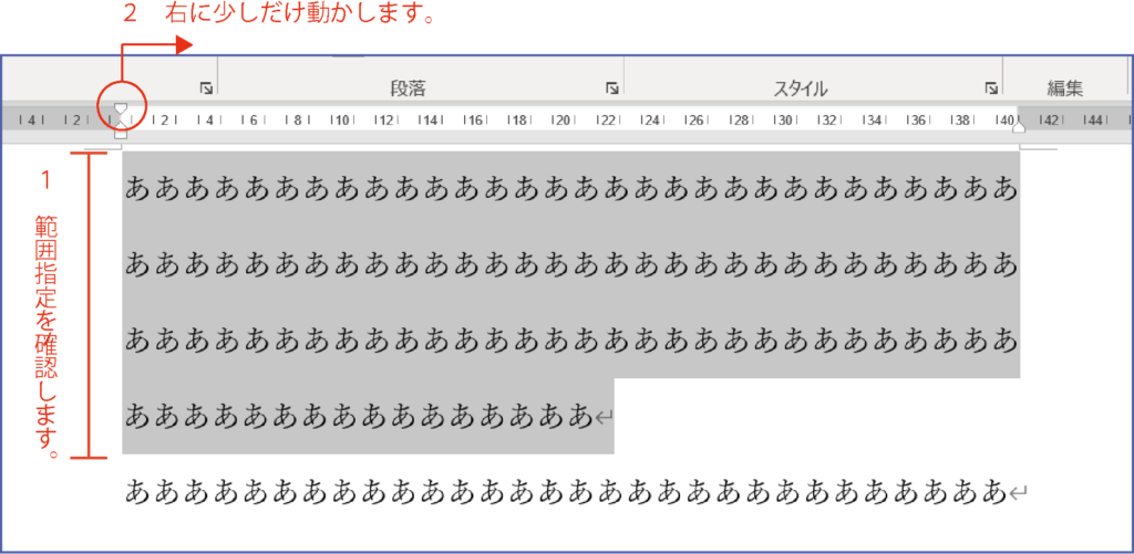 そのため、段落を範囲指定したあと、下画面のように、水平ルーラーのインデントマーカーの上から2つ目のマーカーをクリックして右に動かします。