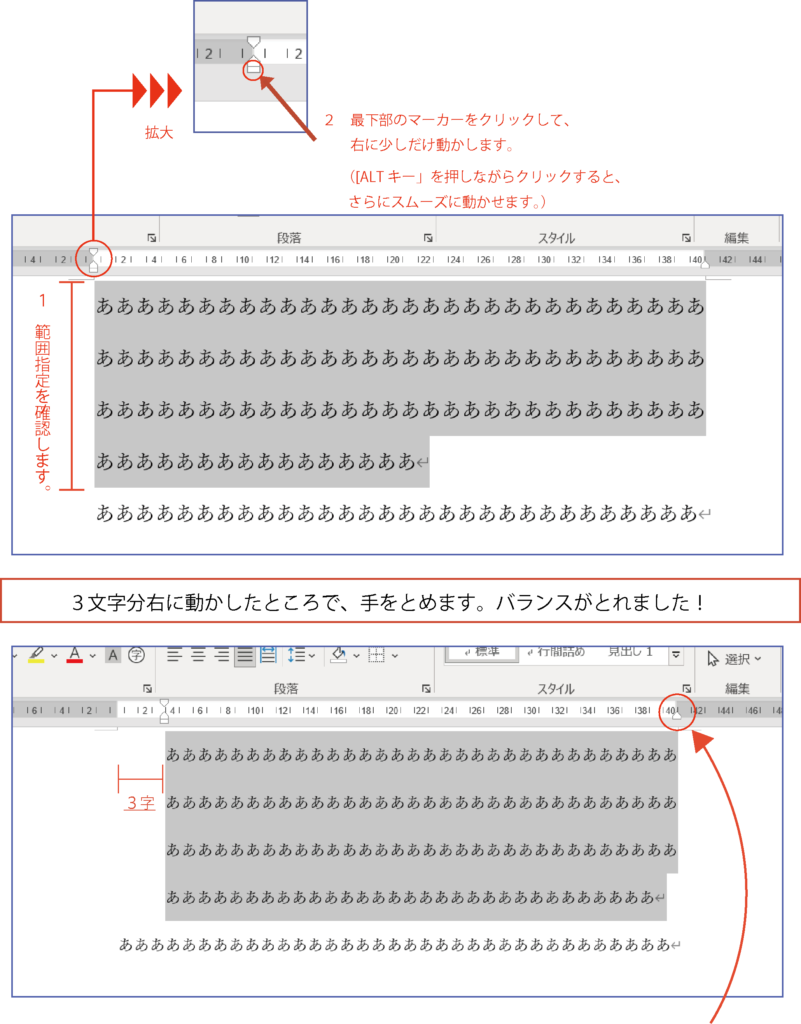 せっかくなので、右のインデントマーカーを使って、右側に余白を作り、段落全体を用紙の中央に寄せることでバランスをとってみます。