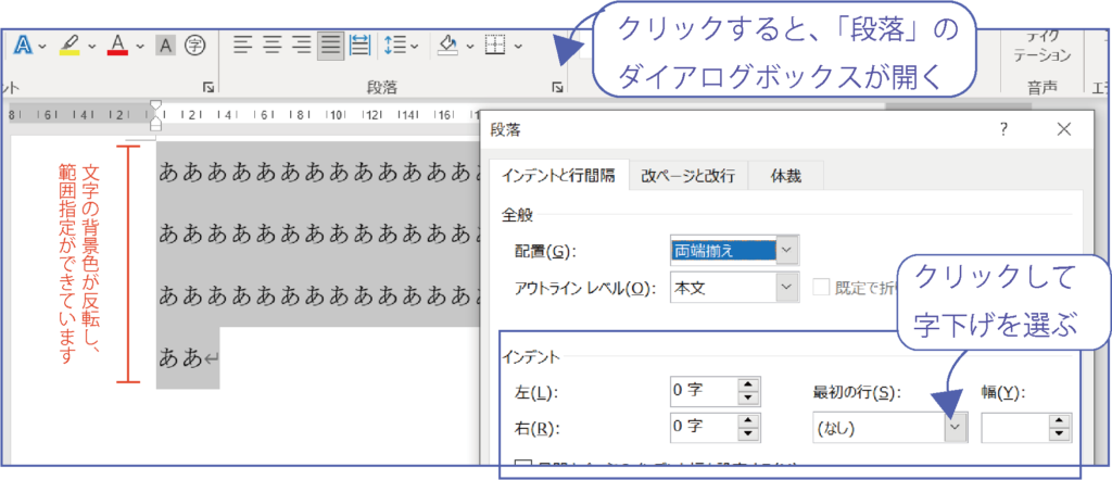 「字下げ」機能は、1行目の最初の文字の位置を調整したいとき、「ぶら下げ」機能は2行目以降の最初の文字の位置を調整したいときに使います。正確に機能を使いたいなら、「段落」のダイアログボックスを使います。ここでは、まず「字下げ機能」を使ってみます。