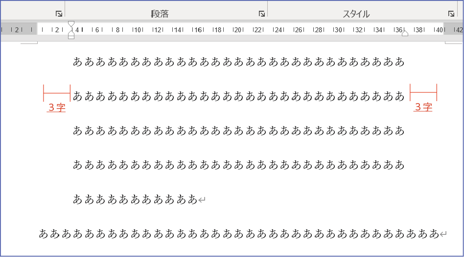 文章が「ああああ~」のため、少々わかりにくいですが、用紙全体をみてバランスをみると、部分的に1つの段落の左右の余白を少し絞ることで、見せたい箇所が強調され、見る方が、見やすくなります。そういった時などにこうしたインデントを使います。