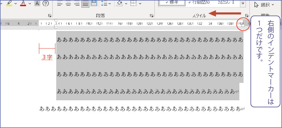 段落全体を動かすのが、このマーカーの使い方です。また、上記の画像の右側にも着目いただきたいのですが、右側にもインデントマーカーがあります。こちらは段落の右側の余白を調整するのに使います。